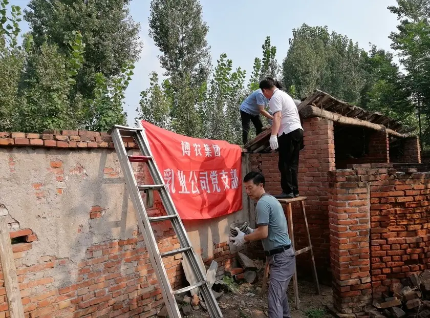 貧困戶魏澤美家是博農(nóng)乳業(yè)公司對口扶貧幫扶戶,公司黨支部了解到魏澤美家中廁所年久失修,給其生活造成不便的實際情況,經(jīng)過研究,決定發(fā)揮公司支部黨員水電、建筑等人才優(yōu)勢,組織黨員直接參與其廁所整修工作。30日下午,乳業(yè)公司黨員12人克服天氣炎熱、工作環(huán)境條件復(fù)雜的多重困難,全身心投入到廁所整修工作中,有的撤除房頂,有的焊接梁架,有的開挖水溝,有的連接電路,用整整一下午時間,完成了房頂撤除更換、連通水電的任務(wù),幫扶工作受到貧困戶魏澤美的交口稱贊。